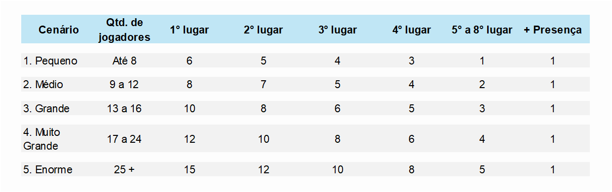 A pontuação exata é definida pela faixa de participantes (cenário) em que o torneio se encaixa