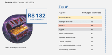 A premiação será em créditos na Gruta BSB e é composta pelo valor adicional das inscrições semanais (R$ 2), sendo distribuída ao final do trimestre entre os jogadores mais bem colocados (top 4) da seguinte forma: